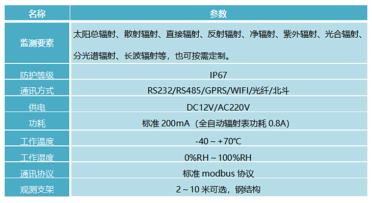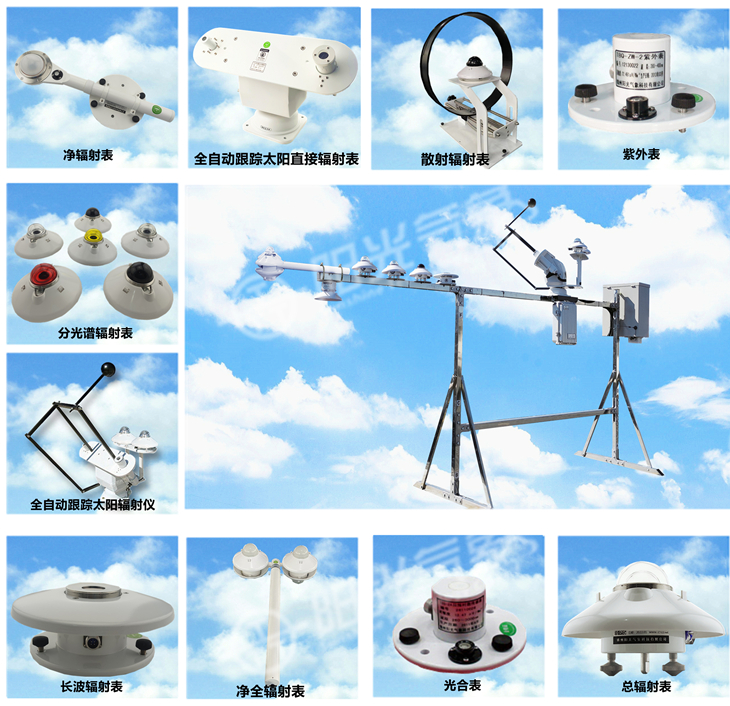 太陽(yáng)輻射是氣象觀測(cè)指標(biāo)中重要內(nèi)容,根據(jù)氣象組織WMO標(biāo)準(zhǔn)要求,太陽(yáng)輻射標(biāo)準(zhǔn)觀測(cè)分為:總輻射、散射輻射、直接輻射、反射輻射、凈全輻射,太陽(yáng)光譜輻射(紫外光、可見(jiàn)光,近紅外光,遠(yuǎn)紅外光)