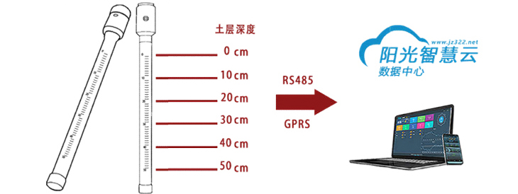 采用FDR原理,根據(jù)監(jiān)測儀發(fā)出的電磁波在不同介電系數(shù)物質(zhì)中的頻率變化測得各土層的濕度,利用高精度數(shù)字溫度傳感器,測量各土層溫度。默認同時測量10cm,20cm,30cm,40m,50cm五個土層的溫度和濕度,適用于具有代表性土壤的長期不間斷監(jiān)測;內(nèi)置RTU及電池,可提供RS485輸出,還可以通過GPRS無線網(wǎng)絡(luò)傳輸數(shù)據(jù)至物聯(lián)網(wǎng)數(shù)據(jù)平臺,實時用電腦或手機查看數(shù)據(jù),方便快捷,極大的滿足了各方面使用的需求。