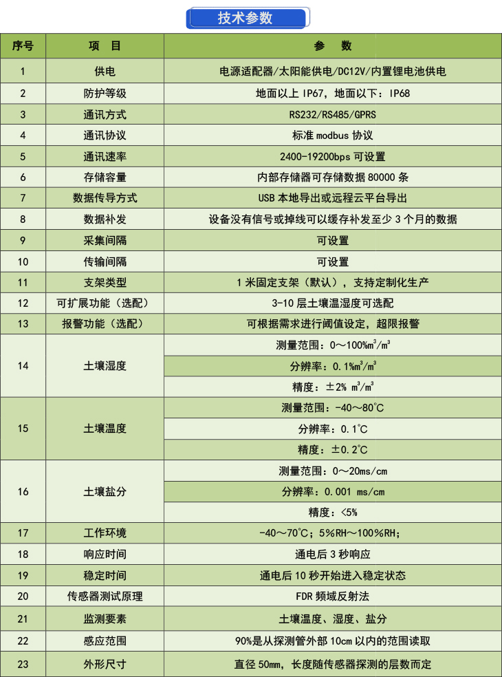 l 可根據(jù)不同的應(yīng)用場合,定制不同深度、不同配置的產(chǎn)品,組多支持10層土壤溫濕度的測量;