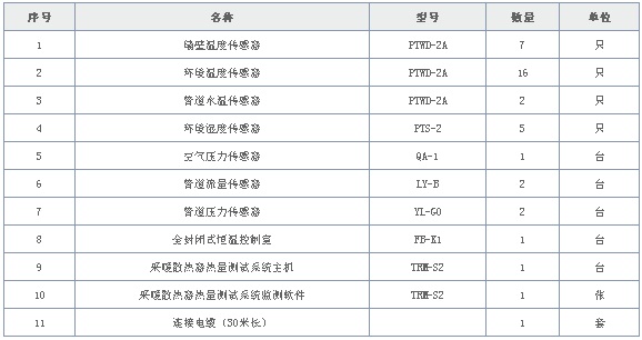產(chǎn)品組成:墻壁溫度傳感器、環(huán)境溫度傳感器、管道水溫傳感器、環(huán)境濕度傳感器、空氣壓力傳感器、管道流量傳感器、管道壓力傳感器、全封閉式恒溫控制室、采暖散熱器熱量測試系統(tǒng)主機、采暖散熱器熱量測試系統(tǒng)監(jiān)測軟件、連接電纜等。