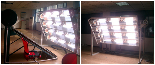 (4)裝有四組大功率風(fēng)機,對發(fā)射光源環(huán)境進行強制冷卻,可對太陽能熱水器、集熱器、電池板、太陽能發(fā)電站等產(chǎn)品進行直接照射。