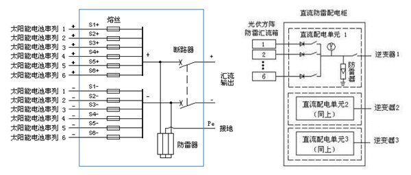 光伏組件陣列通過(guò)直流防雷匯流箱在室外進(jìn)行匯流后,通過(guò)電纜接至配電房的直流防雷配電柜再進(jìn)行一次總匯流。