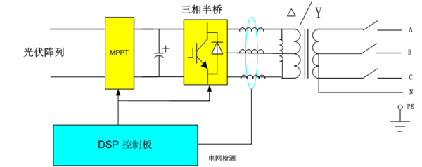 并網(wǎng)逆變電源通過(guò)三相半橋變換器,將光伏陣列的直流電壓變換為高頻的三相斬波電壓,并通過(guò)濾波器濾波變成正弦波電壓接著通過(guò)三相變壓器隔離升壓后并入電網(wǎng)發(fā)電。為了使光伏陣列以最大功率發(fā)電,在直流側(cè)加入了先進(jìn)的MPPT算法。