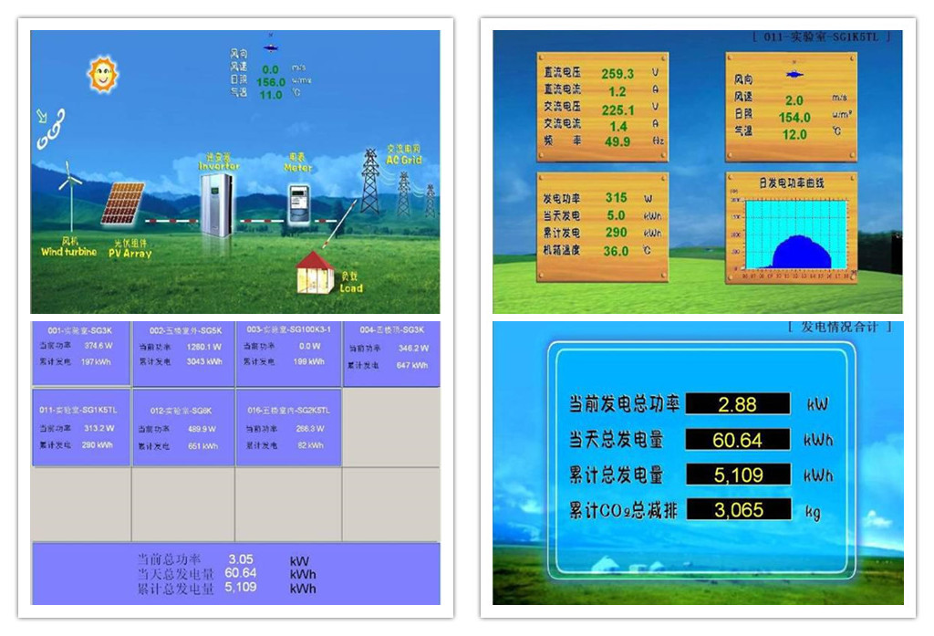 實(shí)時(shí)顯示電站的當(dāng)前發(fā)電總功率、日總發(fā)電量、累計(jì)總發(fā)電量、累計(jì)CO2總減排量以及每天發(fā)電功率曲線圖。