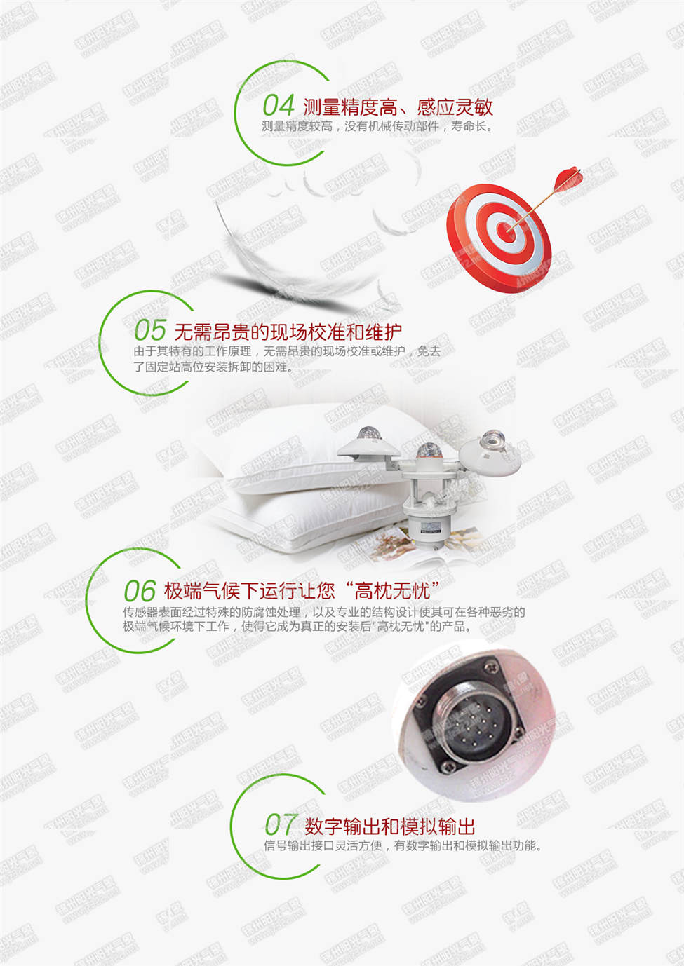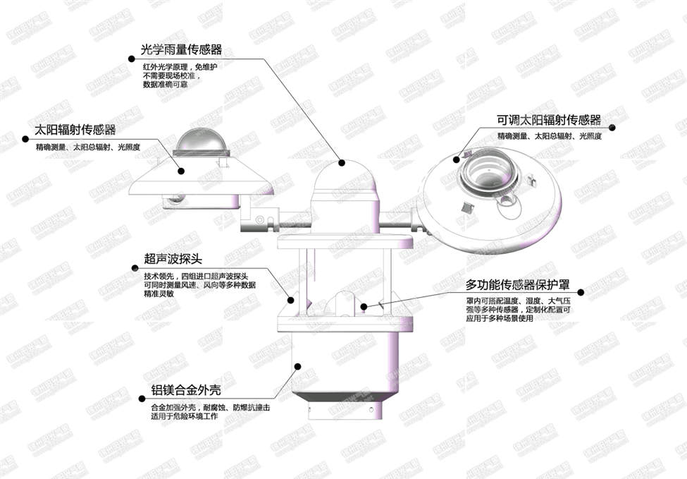 3. 采用先進(jìn)的監(jiān)測(cè)技術(shù),風(fēng)速風(fēng)向的監(jiān)測(cè)采用了超聲波技術(shù),不但測(cè)量精度高,性能穩(wěn)定,而且無(wú)需維護(hù);雨量的監(jiān)測(cè)采用了光學(xué)的原理,體積小巧、免維護(hù),更適于用在無(wú)人值守的現(xiàn)場(chǎng)。