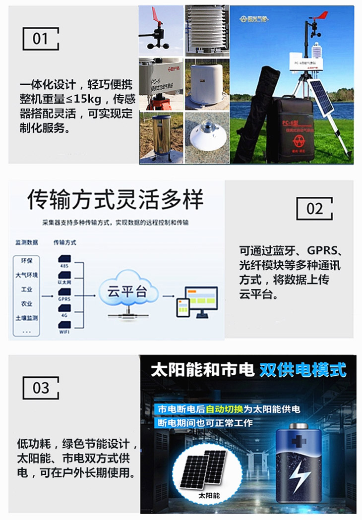 PC-6型便攜式陽光氣象站是非常便捷的氣象觀測(cè)站,核心監(jiān)測(cè)部分整體重量不超過5KG,高度集成,體積小巧,攜帶方便,是一款性價(jià)比突出的小型自動(dòng)氣象站。