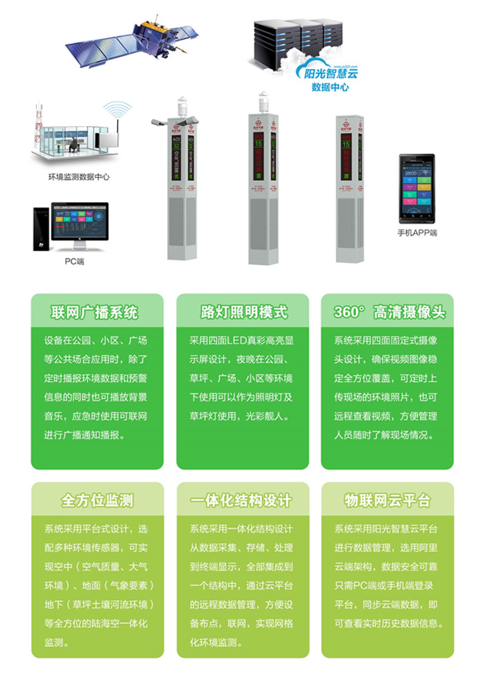 本系統(tǒng)由數(shù)據(jù)采集器、傳感器、無線傳輸系統(tǒng)、后臺數(shù)據(jù)處理系統(tǒng)及信息監(jiān)控管理平臺組成。監(jiān)測子站集成了大氣PM2.5、PM10監(jiān)測、環(huán)境溫濕度及風速風向監(jiān)測、噪聲監(jiān)測、負氧離子、有毒有害氣體監(jiān)測(選配)等多種功能;數(shù)據(jù)平臺是一個互聯(lián)網(wǎng)架構的網(wǎng)絡化平臺,具有對各子站的監(jiān)控功能以及對數(shù)據(jù)的報警處理、記錄、查詢、統(tǒng)計、報表輸出等多種功能。