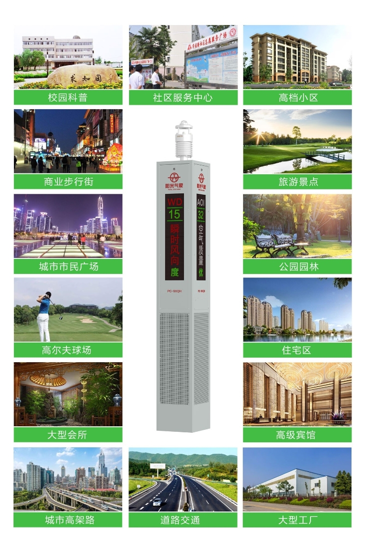 PC-9XQH 景區(qū)氣象站以“物聯(lián)網(wǎng)+智慧感知”為核心,建立覆蓋全區(qū)域的環(huán)境空氣質量自動監(jiān)測網(wǎng)絡,并實時顯示播報。景區(qū)氣象站由金屬外殼立柱、氣象環(huán)境傳感器、系統(tǒng)采集主機、LED顯示、智能語音播報、物聯(lián)網(wǎng)云平臺數(shù)據(jù)存儲、終端顯示組成。