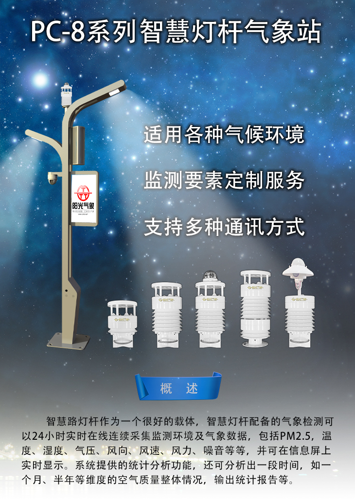 智慧路燈桿作為一個很好的載體,智慧燈桿配備的氣象檢測可以24小時實時在線連續(xù)采集監(jiān)測環(huán)境及氣象數(shù)據(jù),包括PM2.5,溫度、濕度、氣壓、風向、風速、風力、噪音等等,并可在信息屏上實時顯示。系統(tǒng)提供的統(tǒng)計分析功能,還可分析出一段時間,如一個月、半年等維度的空氣質量整體情況,輸出統(tǒng)計報告等。