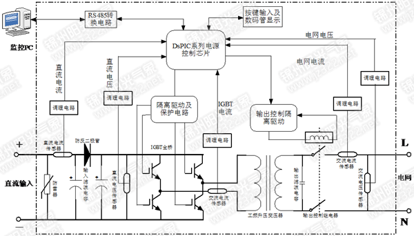 7、單機逆變器由IGBT逆變支路、逆變器輸出變壓器、逆變器濾波電感和電容、逆變器的驅動、控制電路、逆變器溫度傳感器組成。