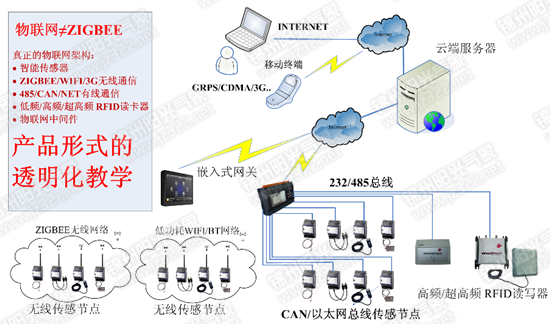 基于工程方案可以實現(xiàn)通用的物聯(lián)網(wǎng)網(wǎng)絡(luò)架構(gòu),在傳感層通過無線組網(wǎng)或現(xiàn)場總線組網(wǎng)實現(xiàn)對各種物理量的傳感采集和反饋控制,通過RFID讀寫器實現(xiàn)對人或物體的ID識別,通過視頻圖像采集設(shè)備實現(xiàn)環(huán)境圖像數(shù)據(jù)獲取,數(shù)據(jù)通過網(wǎng)關(guān)轉(zhuǎn)換為標準的網(wǎng)絡(luò)數(shù)據(jù)流匯聚到云端服務(wù)器,在服務(wù)器端實現(xiàn)數(shù)據(jù)的智慧處理,再由服務(wù)器通過Internet或3G網(wǎng)絡(luò)實現(xiàn)廣域的數(shù)據(jù)發(fā)布,與各種終端,包括手機實現(xiàn)智能的交互與管理。