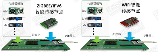 把無(wú)線通信核心模塊插到智能傳感器底板上,便可以組合成各種無(wú)線通信形式的傳感節(jié)點(diǎn)。