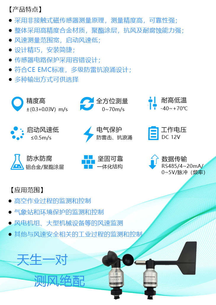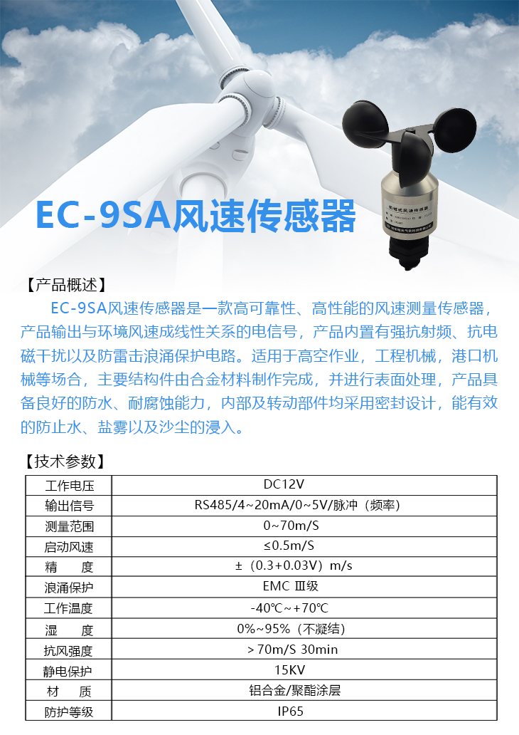 EC-9SA風(fēng)速傳感器是一款高可靠性、高性能的風(fēng)速測(cè)量傳感器,產(chǎn)品輸出與環(huán)境風(fēng)速成線性關(guān)系的電信號(hào),產(chǎn)品內(nèi)置有強(qiáng)抗射頻、抗電磁干擾以及防雷擊浪涌保護(hù)電路。適用于高空作業(yè),工程機(jī)械,港口機(jī)械等場(chǎng)合,主要結(jié)構(gòu)件由合金材料制作完成,并進(jìn)行表面處理,產(chǎn)品具備良好的防水、耐腐蝕能力,內(nèi)部及轉(zhuǎn)動(dòng)部件均采用密封設(shè)計(jì),能有效的防止水、鹽霧以及沙塵的浸入。