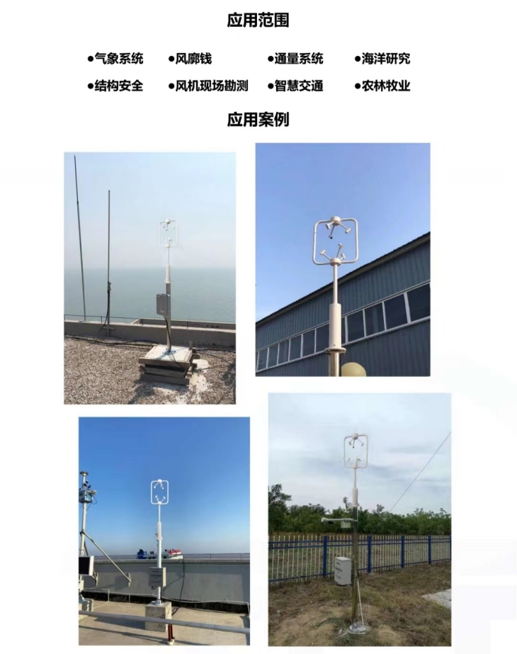 三維超聲波風(fēng)速風(fēng)向傳感器具有結(jié)構(gòu)緊湊,沒有任何移動(dòng)部件,堅(jiān)固 耐用的特點(diǎn)。能夠測量水平和垂直方向的風(fēng)向, X/Y/Z軸風(fēng)速(即U、V、 W矢量輸出)??梢赃m應(yīng)在各種環(huán)境下,全天候、長久的正常工作,為各 領(lǐng)域的氣象監(jiān)測提供可靠數(shù)據(jù)。三維超聲波風(fēng)向風(fēng)速傳感器用來測量近 地風(fēng)向、風(fēng)速。廣泛應(yīng)用于城市環(huán)境監(jiān)測、風(fēng)力發(fā)電、氣象監(jiān)測、橋梁 隧道、航海船舶、航空機(jī)場等領(lǐng)域。