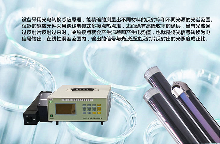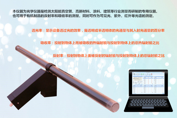 本儀器為光學(xué)儀器是檢測太陽能真空管,太陽能集熱器及高新材料、涂料、顏料、建筑等行業(yè)精確測量而研制的專用儀器,它可用于各種太陽能真空管,太陽能集熱器涂層、漆膜、油脂、簿膜、塑料制品、有機(jī)制品反射率和吸收率的測量。