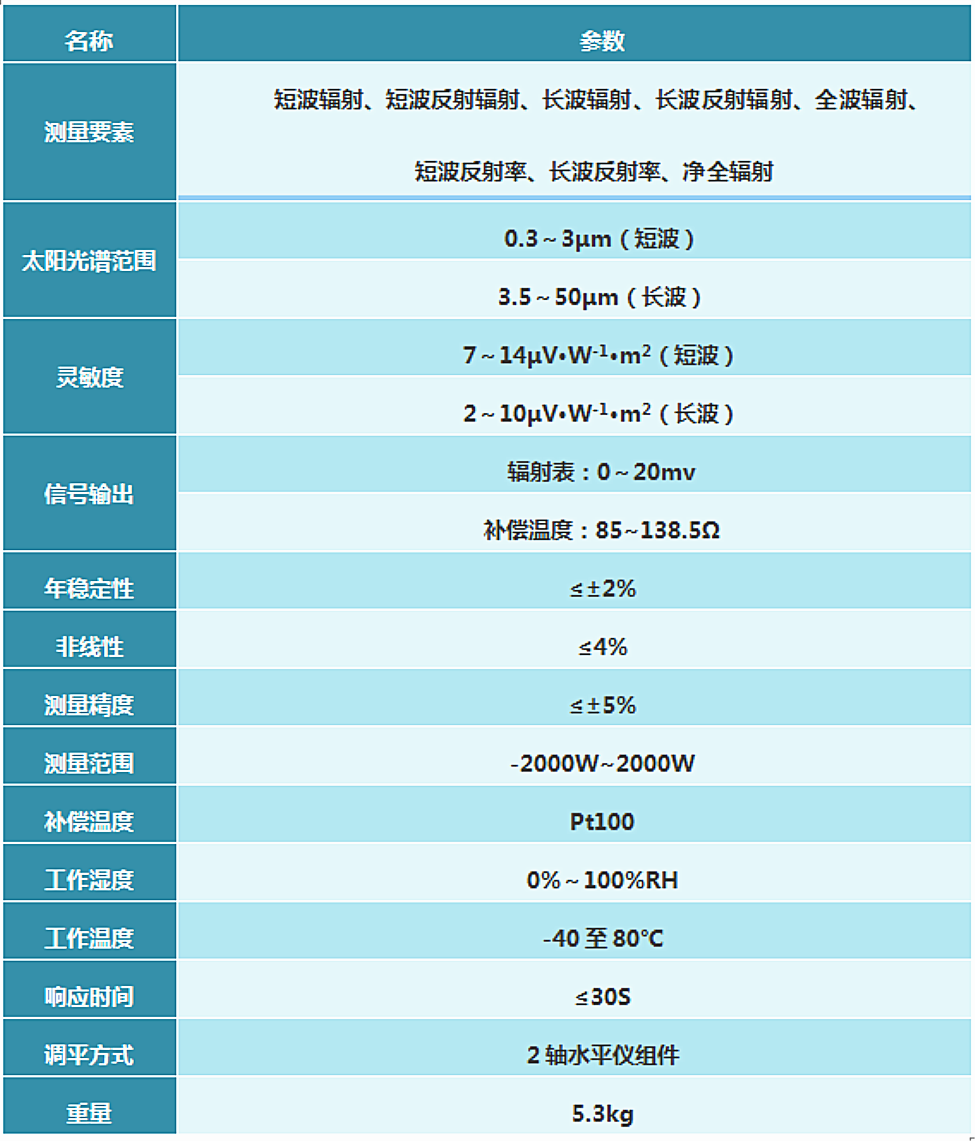 每只輻射表都分別有各自的靈敏度系數(shù)和輸出導(dǎo)線,可單獨輸出各個數(shù)據(jù),同時通過各自的輸出數(shù)據(jù)進(jìn)行組合,分別能測量短波輻射、短波反射輻射、長波輻射、長波反射輻射、全波輻射、凈全輻射、短波反射率和長波反射率。